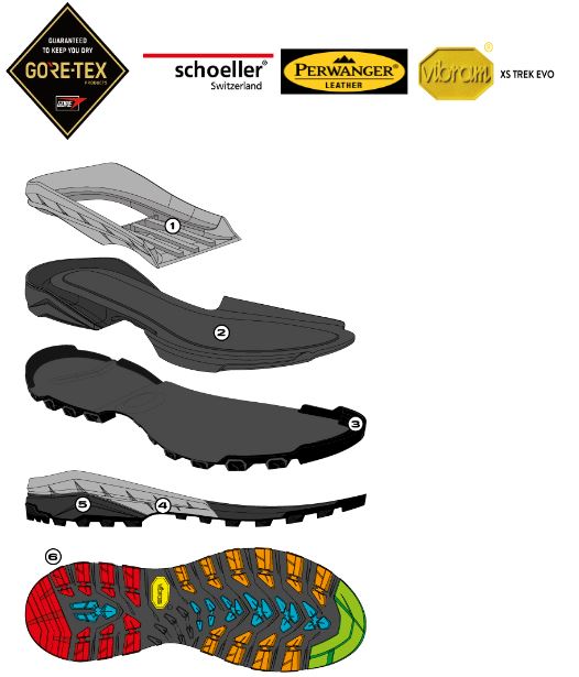 The upper is in 1.7-1.9 mm Perwanger® suede leather with characteristics of waterproofing, breathability, scratch-resistant surface and durability. It integrates a good higher protection in the ankle area for better support, protection and comfort thanks to an Autofit 3D collar in padded fabric able to stabilize the entire foot without pressure points and wrap the ankle following its movement. The gusseted togue is connected to the upper on both sides, remains well centered and prevents debris from entering the shoe. Schoeller fabric maintains the ideal foot climate independent of changes in outside temperature.