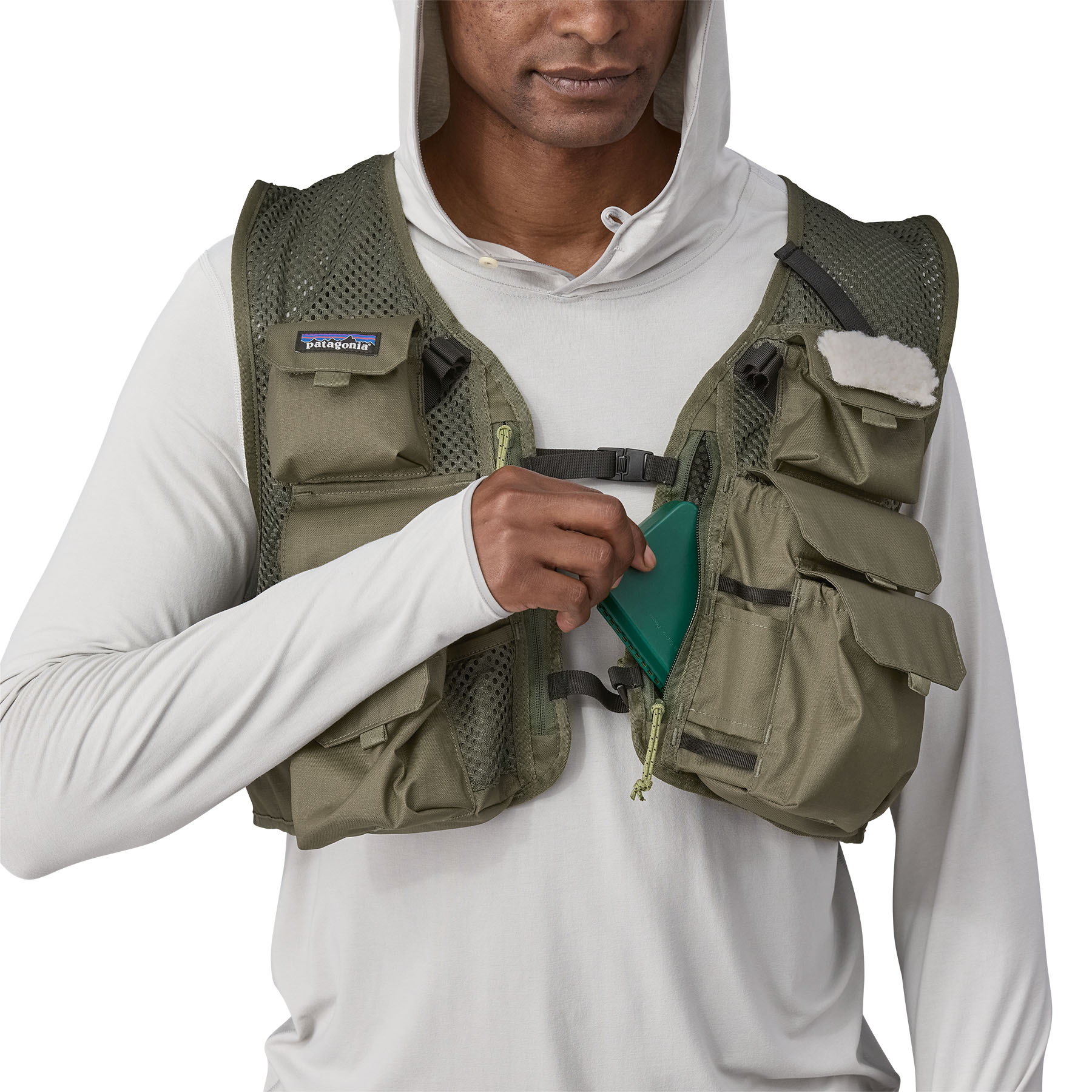 Two zippered, pass-through storage pockets on the back of the vest have hydration compatibility; two large fly-box pockets; four additional vertical pockets; and one floatant pocket