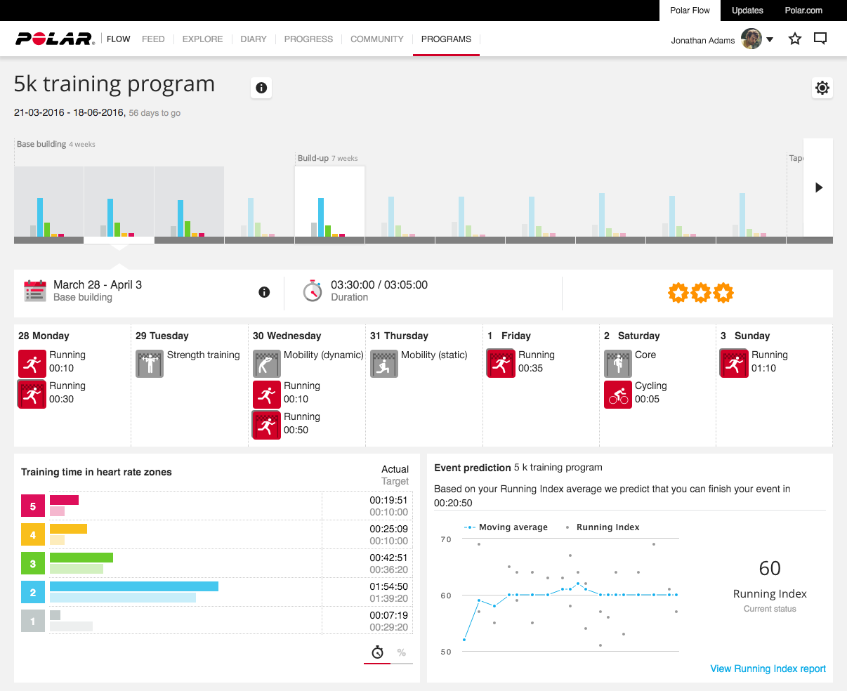 И ако сте любопитни за колко време може да се борите, разгледайте доклада за текущия индекс в Polar Flow, който се вижда в долния десен ъгъл. Той изчислява вашите крайни времена за различни събития, като например полумаратон.