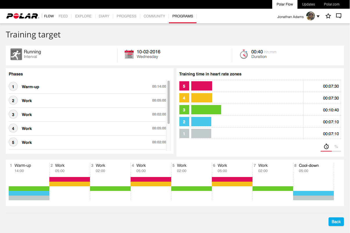 След като синхронизирате вашия План за бягане от Polar Flow с часовника си, може да започнете тренировъчна сесия, директно от изгледа към Дневника на часовника си.  Ако правите сесията за интервални тренировки, която разгледахме по-горе, вашият Polar M400 ще ви преведе през тренировката, след като изберете тази тренировъчна сесия и натиснете старт.